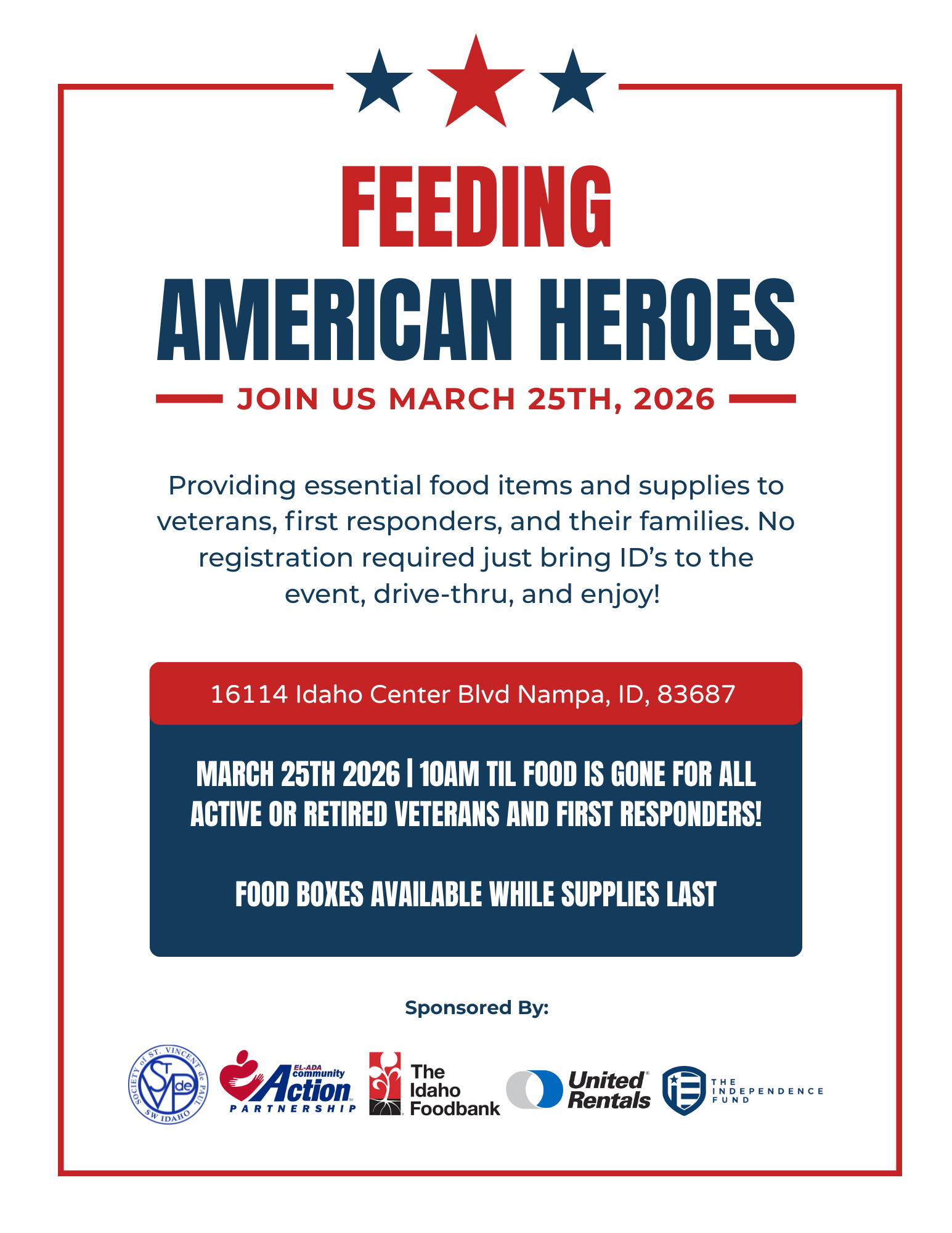 Feeding American Heroes will have a drive-thru Food Distribution on Wednesday, March 25 beginning at 10:00 a.m. in the Ford Idaho Center Parking Lot. Event will run until the food is gone.