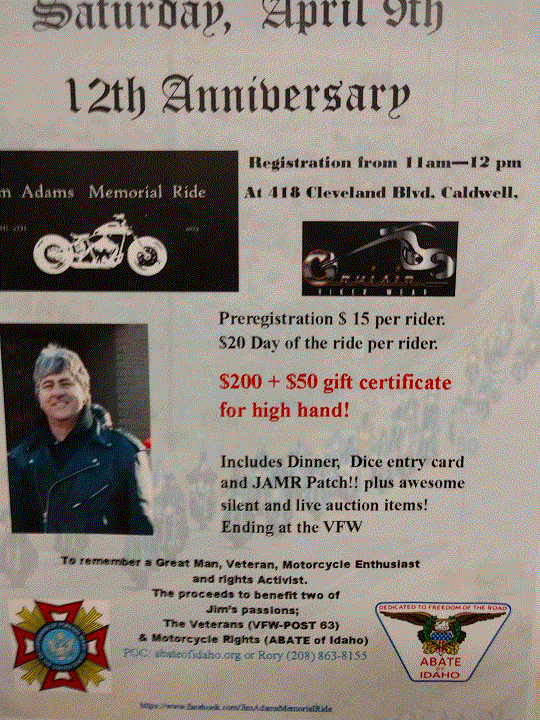 « All Events This event has passed. 12th Annual JAMR Ride April 9, 2022 @ 11:00 - 17:00 $20.00 « Post Open Post Open » Post Views: 0 Add to calendar Google Calendar iCalendar Outlook 365 Outlook Live Details Date: April 9, 2022 Time: 11:00 - 17:00 Cost: $20.00 Event Category: Community Events Event Tags:ABATE, ABATEOfIdaho, jamesadamsmemorialride, jamr, motorcycle, post63 Venue VFW Post 63 8931 Ardene St. Boise, ID 83709 United States + Google Map