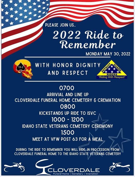« All Events This event has passed. 2022 Ride to Remember May 30, 2022 @ 07:00 - 15:00 « Post Open Idaho State Veterans Cemetery Memorial Day » Post Views: 0 Add to calendar Google Calendar iCalendar Outlook 365 Outlook Live Details Date: May 30, 2022 Time: 07:00 - 15:00 Event Category: Community Events Event Tags:cloverdalefuneralhome, honor, idahostateveteranscemetery, memorial, motorcycle, patriotguardriders, ridetoremember