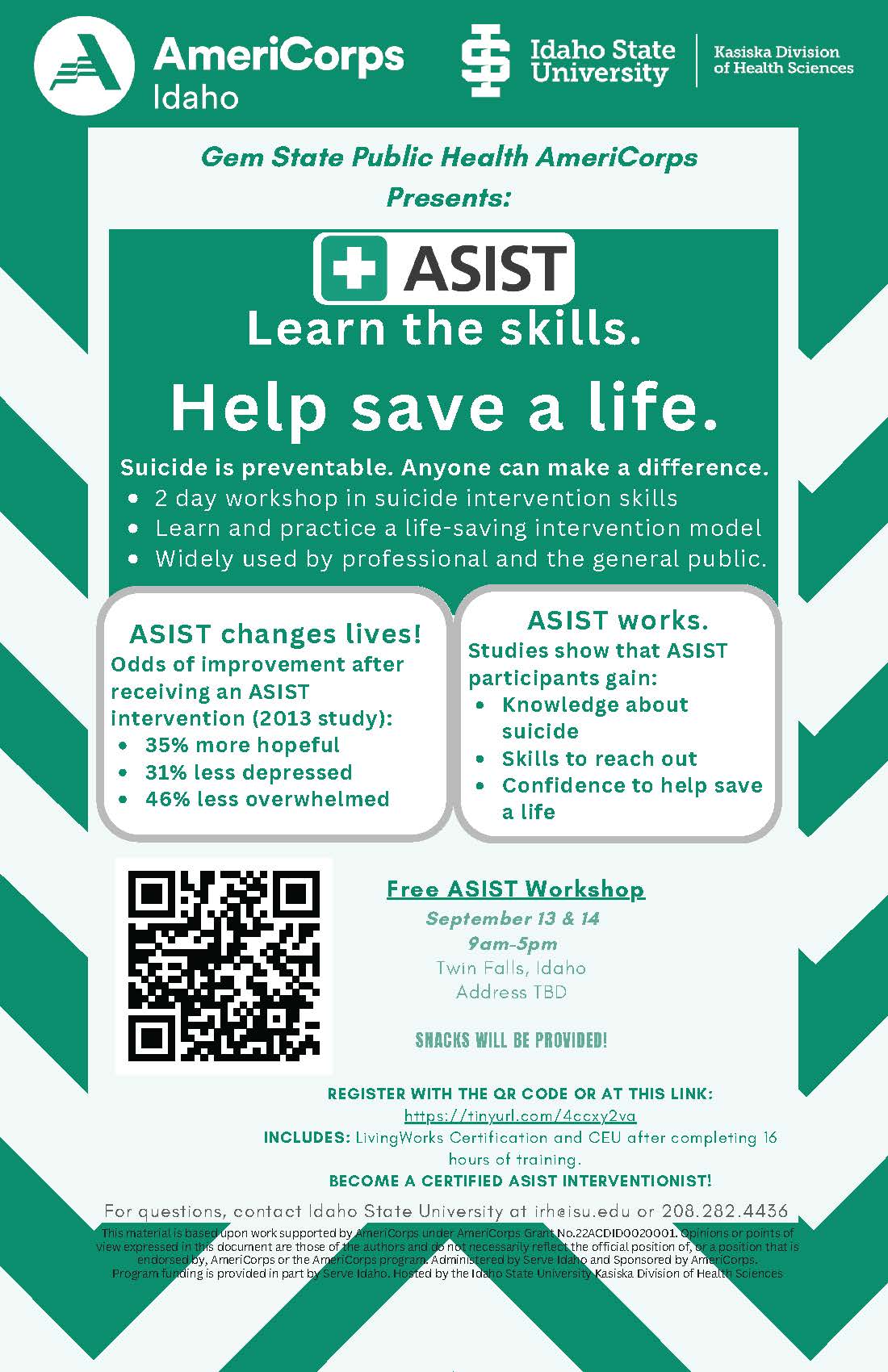 « All Events This event has passed. ASIST Suicide Intervention Training – Twin Falls September 13, 2023 @ 09:00 - 17:00 « Post Open Post Open » Post Views: 0 Add to calendar Google Calendar iCalendar Outlook 365 Outlook Live Details Date: September 13, 2023 Time: 09:00 - 17:00 Event Category: Community Events Event Tags:AmeriCorpsIdaho, ASIST, IdahoState
