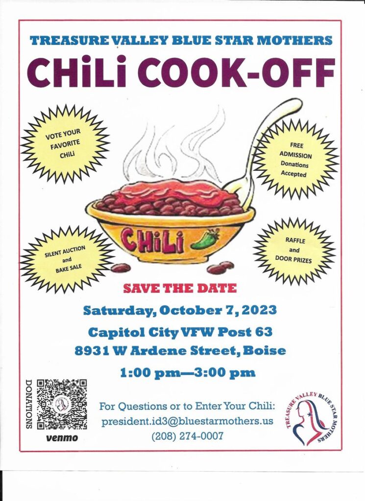 « All Events This event has passed. Blue Star Mothers Chili Cook-Off October 7, 2023 @ 13:00 - 15:00 « Global War on Terror Veteran recognition Day Post Meeting » Post Views: 0 Add to calendar Google Calendar iCalendar Outlook 365 Outlook Live Details Date: October 7, 2023 Time: 13:00 - 15:00 Event Category: Events Event Tags:ChiliCookoff, PostHome, TreasureValleyBlueStarMothers, TVBSM Venue VFW Post 63 8931 Ardene St. Boise, ID 83709 United States + Google Map
