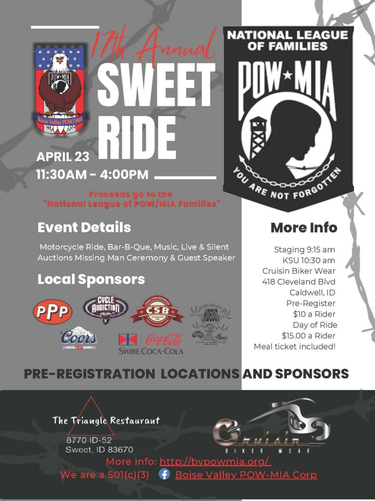 Boise Valley POW/MIA Sweet Ride – starts at Cruisin Bike Wear in Caldwell at concludes with a BBQ in Sweet, Idaho. Registration at 9:00 a.m., Kick Stand Up at 10:30 a.m., BBQ, Music, Guest Speaker, and Auction from 11:30 a.m. – 4:00 p.m. at the Triangle Restaurant in Sweet. Cost is $10 if you preregister at Cruisin or Triangle, or $15 the day of the event. Everyone is welcome – just come to Sweet for the BBQ and camaraderie if you don’t ride