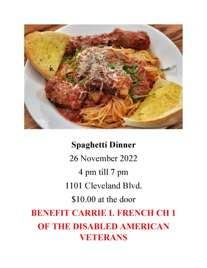 The Caldwell DAV Chapter 1 will be having a Spaghetti Dinner on Saturday, November 26 from 4:00-7:00 p.m. at the Caldwell Veterans Memorial Hall. Just $10 gets you a good meal with good company!