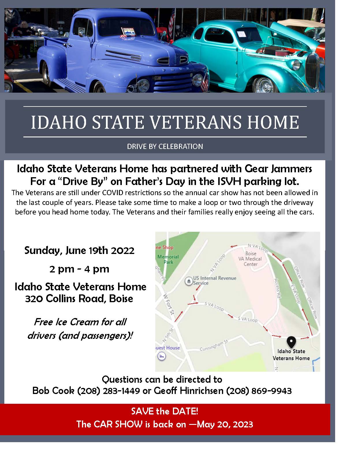 « All Events This event has passed. Drive by Celebration at the Idaho State Veteran’s Home June 19, 2022 @ 14:00 - 16:00 « VFW District 5 Honor Guard Practice Post Open » Post Views: 0 Add to calendar Google Calendar iCalendar Outlook 365 Outlook Live Details Date: June 19, 2022 Time: 14:00 - 16:00 Event Tags:carshow, fathersday, idahostateveteranshome, mitzicheldelin