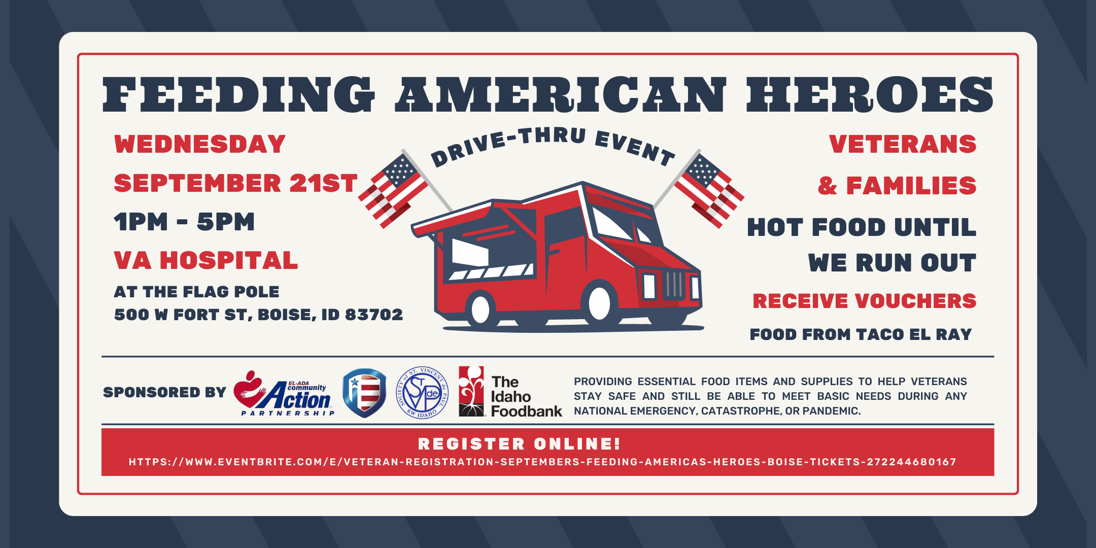 « All Events This event has passed. FREE FOOD GIVEAWAY – BOISE VAMC September 21, 2022 @ 13:00 - 17:00 « Post Closed Post Open » Post Views: 0 Add to calendar Google Calendar iCalendar Outlook 365 Outlook Live Details Date: September 21, 2022 Time: 13:00 - 17:00 Event Category: Community Events Event Tags:BVAMC, IndependenceFund, vamc Venue Boise VAMC 500 W. Fort St. Boise, Idaho 83702 + Google Map