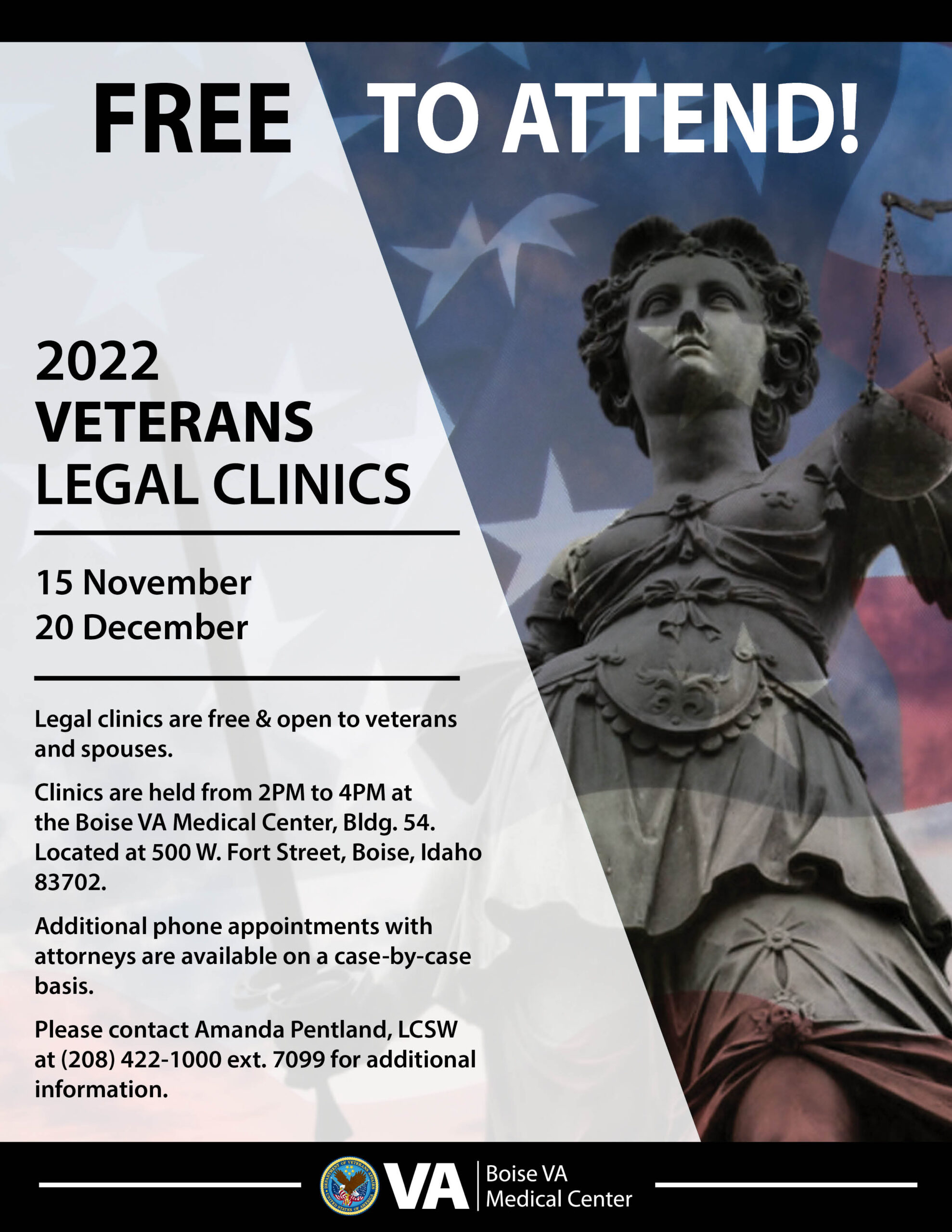The Veterans Legal Clinic is held on the Boise VA campus and located in building 54 from 2-4pm. Please see attached flyer for upcoming dates. If you have any questions, you can contact Sarah Kearney (x3500) or Amanda Pentland (x7099).