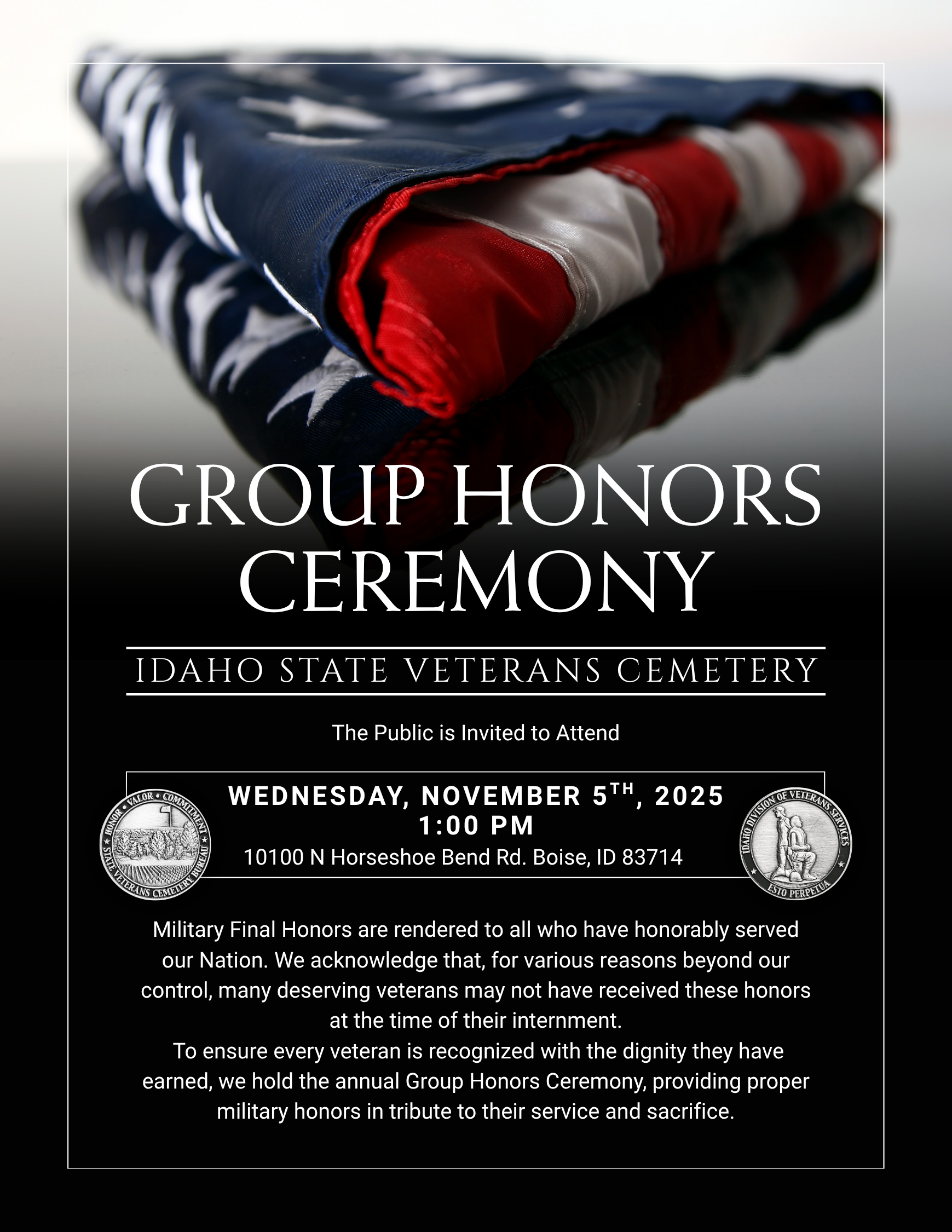 « All Events This event has passed. Group Honors Ceremony November 5, 2025 @ 13:00 - 17:00 « VFW District 5 Honor Guard Event Post Open » Post Views: 0 Add to calendar Google Calendar iCalendar Outlook 365 Outlook Live Details Date: November 5, 2025 Time: 13:00 - 17:00 Event Category: Community Events Event Tags:GroupHonors, idahostateveteranscemetery Venue Idaho State Veterans Cemetery 10100 N Horseshoe Bend Rd Boise, ID 83714 United States + Google Map
