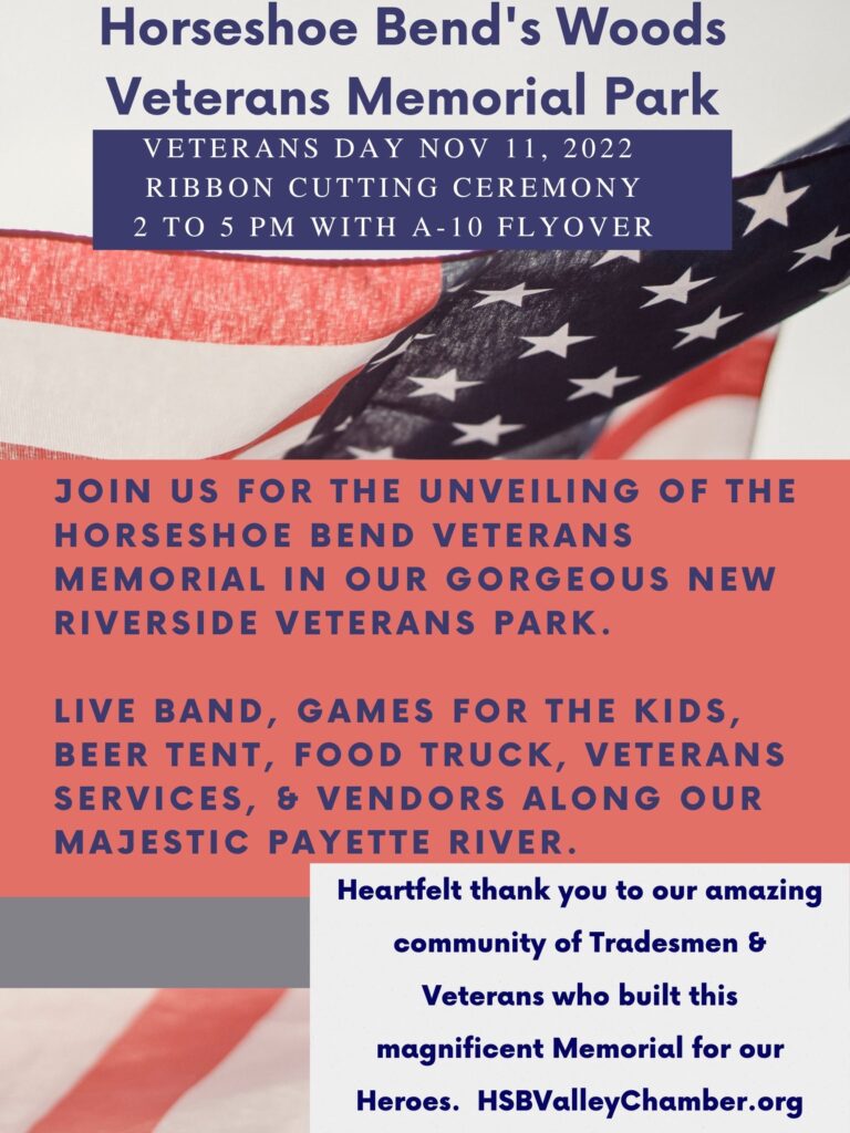 The Horseshoe Bend Veterans Memorial and Wall of Heroes was dedicated Memorial Day, 2022 within the Woods Veterans Memorial Park, located on Highway 55 just northwest of the Payette River Bridge.
