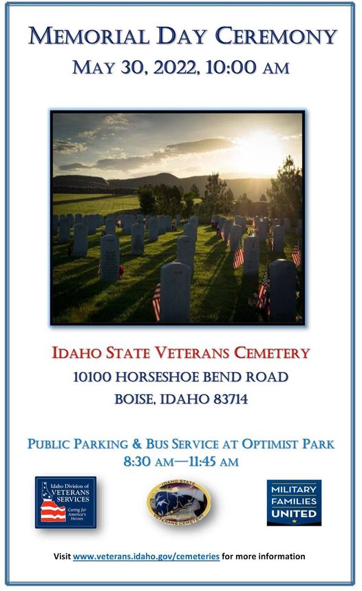 « All Events This event has passed. Idaho State Veterans Cemetery Memorial Day May 30, 2022 @ 10:00 - 11:00 « 2022 Ride to Remember Warhawk Memorial Day Flyovers » Post Views: 0 Add to calendar Google Calendar iCalendar Outlook 365 Outlook Live Details Date: May 30, 2022 Time: 10:00 - 11:00 Event Category: Community Events Event Tags:idahostateveteranscemetery, memorialday, memorialday2022 Venue Idaho State Veterans Cemetery 10100 N Horseshoe Bend Rd Boise, ID 83714 United States + Google Map