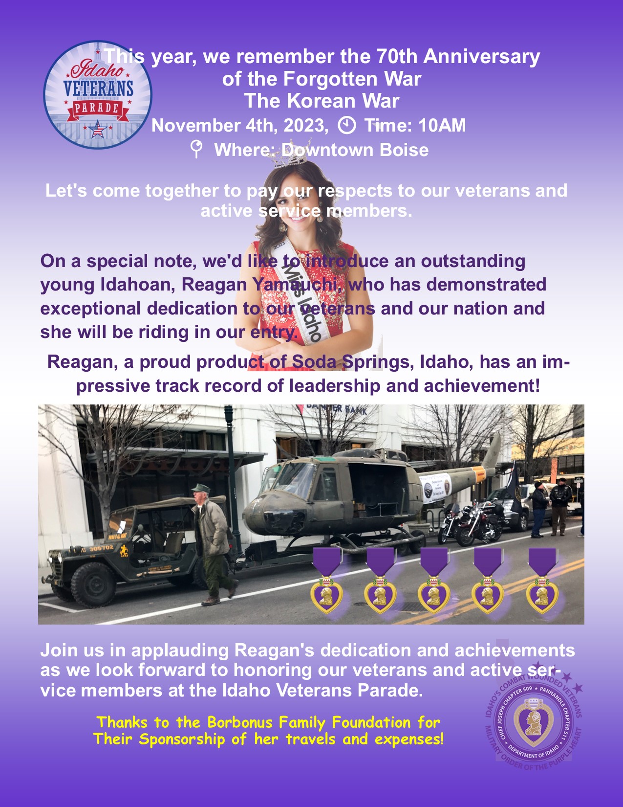 The Idaho Veterans Parade will take place in Boise on Saturday, November 4, 2023. Attached is a letter from Veteran Organization Coordinator for the Parade – Marie Penavs.