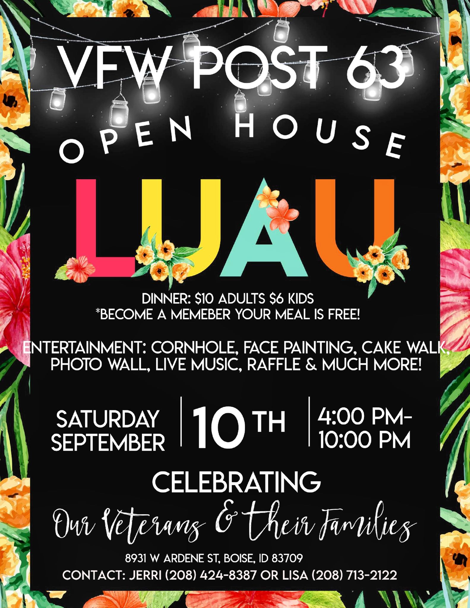 « All Events This event has passed. Luau and Open House! September 10, 2022 @ 16:00 - 22:00 $10.00 « VFW District 5 Honor Guard Event Post Closed » Dinner is pulled pork, baked beans, coleslaw and chips $10 for adults and $6 for kids under 12yrs. Post Views: 0 Add to calendar Google Calendar iCalendar Outlook 365 Outlook Live Details Date: September 10, 2022 Time: 16:00 - 22:00 Cost: $10.00 Event Category: Events Event Tags:Luau, Open House, post63, PostHome Venue VFW Post 63 8931 Ardene St. Boise, ID 83709 United States + Google Map
