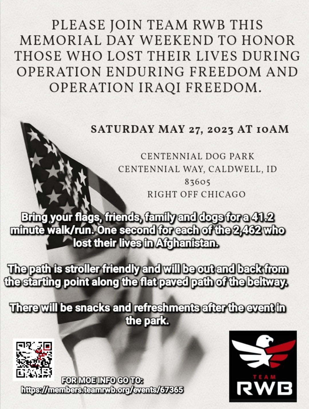 Please join Team RWB this weekend in Caldwell to honor those who lost their lives during Operation Enduring Freedom and Operation Iraqi Freedom. Saturday, May 27 at 10am – see flyer for details.