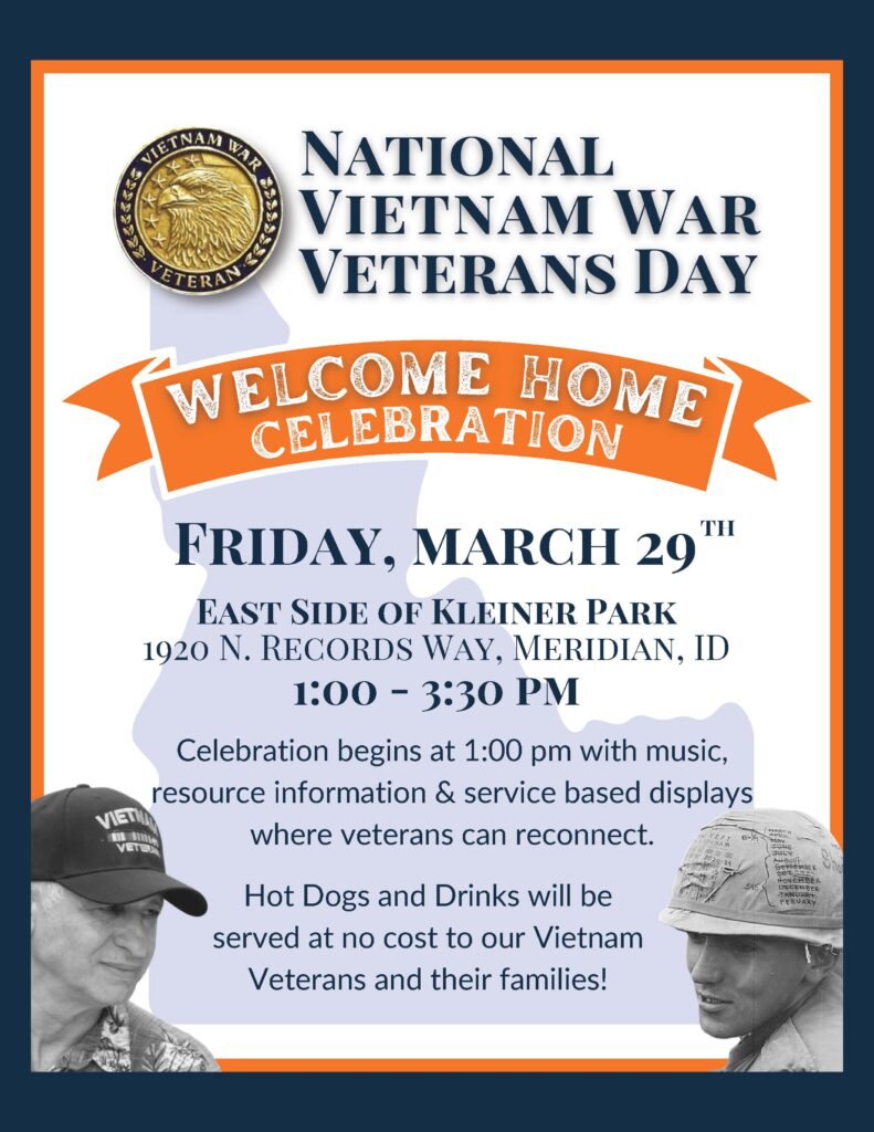 The 4th Annual Vietnam Veterans Recognition Day celebration will take place in Meridian on Friday, March 29 from 1:00-3:30 p.m. at Kleiner Park (in the shelter east of the Senior Center). Food, music, flyovers, speakers, and countless resources for our Veterans. Please come out and enjoy an afternoon of remembrance and camaraderie.