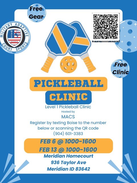 « All Events This event has passed. Military Adaptive Court Sports (MACS) Pickleball Clinic February 13 @ 10:00 - 16:00 « Post Open Post Open » Post Views: 0 Add to calendar Google Calendar iCalendar Outlook 365 Outlook Live Details Date: February 13 Time: 10:00 - 16:00 Event Category: Community Events Event Tags:MACS, MilitaryAdaptiveCourtSports, Pickleball, Sports Venue Meridian Homecourt 936 Taylor Ave. Meridian, ID 83642 United States + Google Map