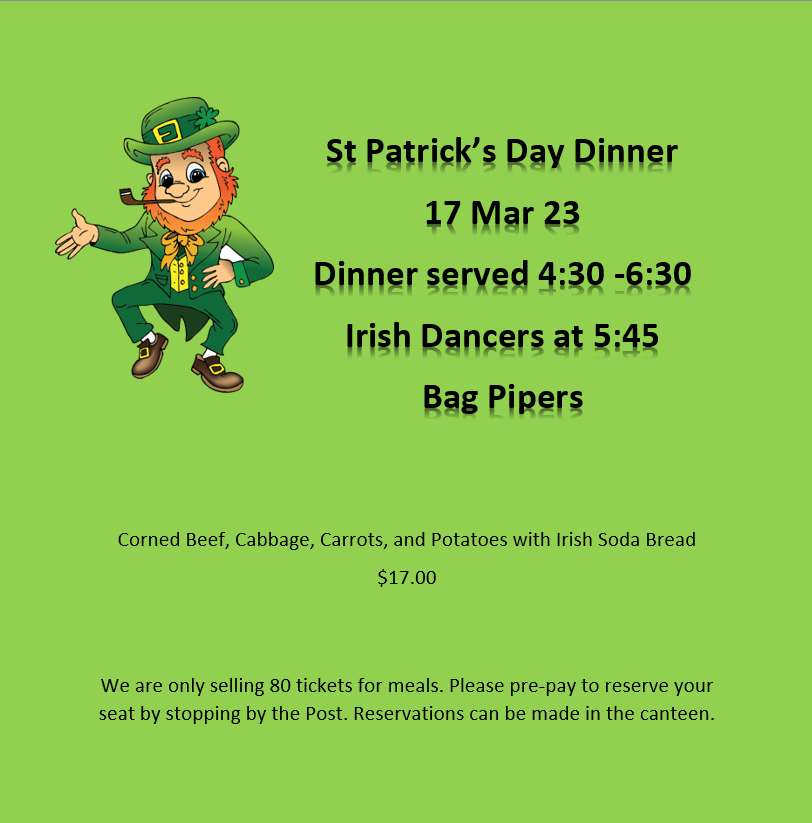 March 4th Update: Just a heads up on Saint Patrick’s there will be a $5 ENTERTAINMENT FEE for those that are not eating and just coming to watch and listen to the dancers and bagpiper!! You can pre-pay to reserve a seat or pay that night, anyone that has not paid by 5:30 that night will be asked to leave! Also there are only 84 folding chairs in the hall and 30 bar chairs ( that includes the 6 barstools) we have room for 100 to stand, PLEASE KEEP THIS IN MIND IF YOU PLAN ON ATTENDING.