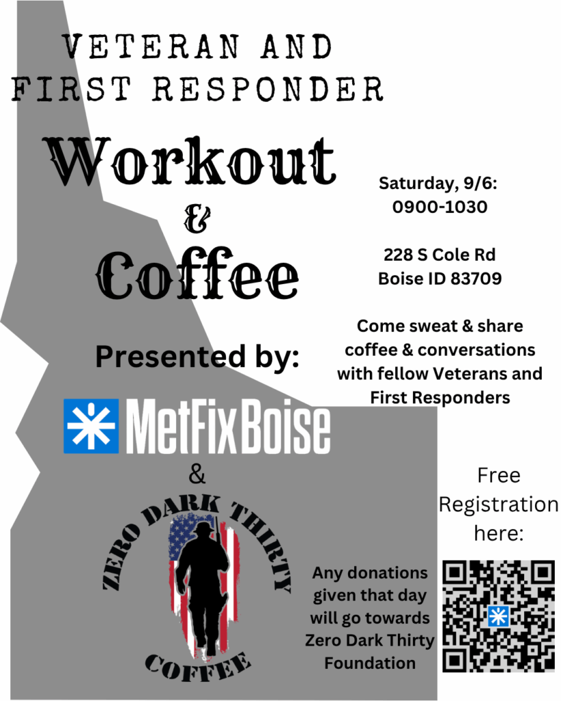 « All Events This event has passed. Veterans and First Responders Workout and Coffee Event September 6, 2025 @ 09:00 - 10:30 « Post Closed Post Closed » Post Views: 0 Add to calendar Google Calendar iCalendar Outlook 365 Outlook Live Details Date: September 6, 2025 Time: 09:00 - 10:30 Event Category: Community Events Event Tags:MetFixBoise, WorkoutAndCoffee, ZeroDarkThirty
