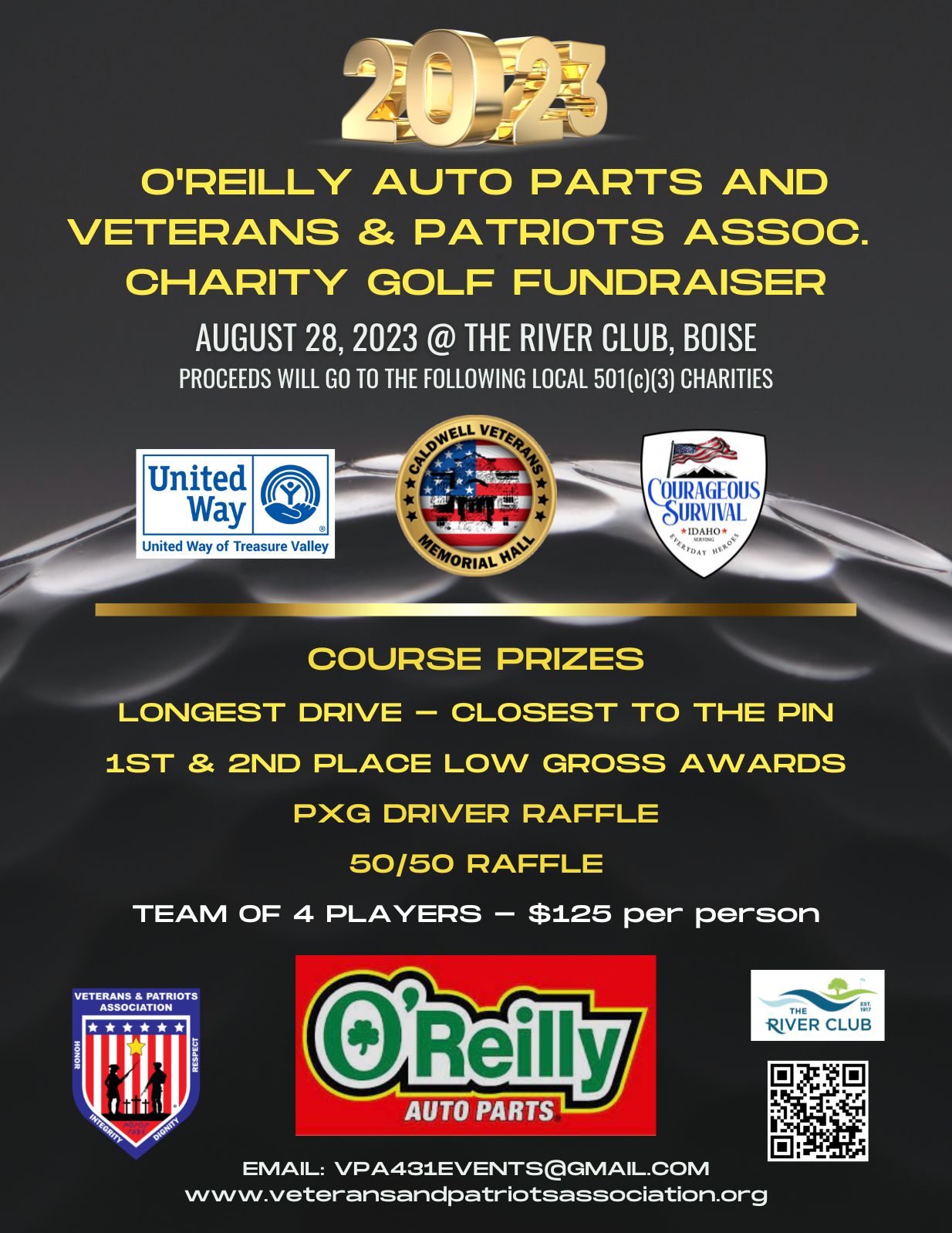 « All Events This event has passed. Veterans & Patriots Charity Golf Tournament August 28, 2023 @ 08:00 - 17:00 « VPA Annual Charity Golf tournament Post Open » Post Views: 0 Add to calendar Google Calendar iCalendar Outlook 365 Outlook Live Details Date: August 28, 2023 Time: 08:00 - 17:00 Event Category: Community Events Event Tags:Charity, fundraiser, Golf, golftournament, O'ReillyAutoParts, veteransandpatriotsassociation Website: www.veteransandpatriotsassociation.org
