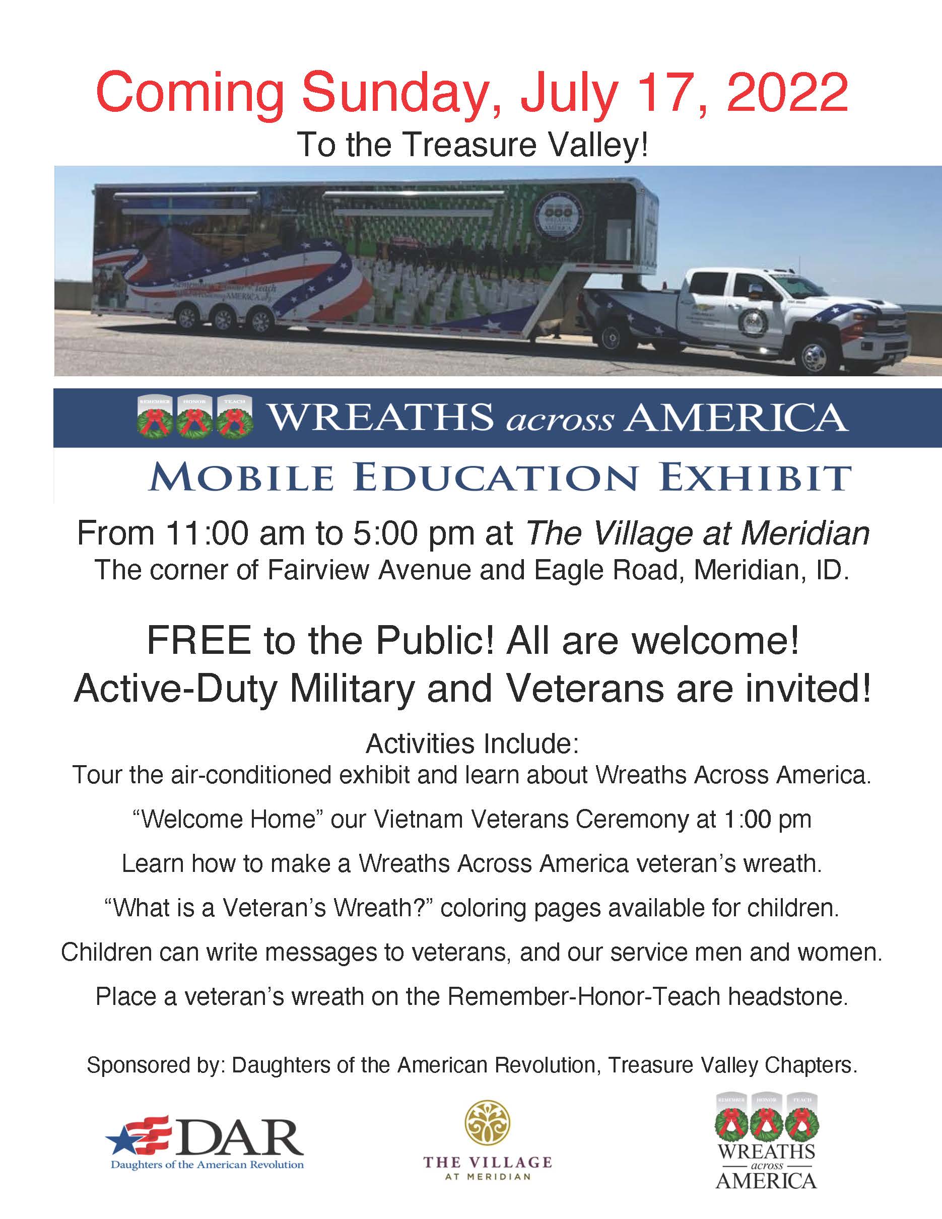 Wreaths Across America’s Mobile Education Exhibit (MEE) is coming to the Villages at Meridian on Sunday, July 17, 2022 from 11:00 am to 5:00 pm. The MEE’s goal is to bring local communities and our military together with education, stories and interactive connections. It is a 48 foot mobile, air conditioned exhibit with a 24 foot person screening room that showcases the Wreath Across America’s mission to remember our fallen U.S. veterans, honor those who serve, and teach our children the value of freedom. This is a free event that is traveling across America and is coming to Idaho during the month of July. If you would like additional information about this event please contact the event’s Idaho sponsors: Ee-dah-how Chapter, Daughters of the American Revolution (DAR) – Peggy Orbea at pjorbea.dar@gmail.com; Eagle Chapter, DAR – Barbara Grant at boisegrant@gmail.com; Applegate Idaho Trail Chapter, DAR – Ethel Rouke at etheliccw@gmail.com